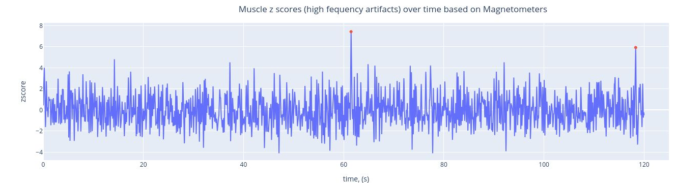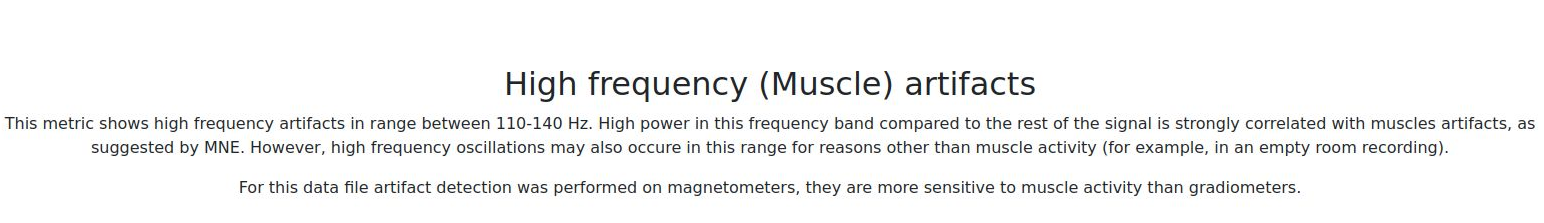 Muscle artifacts appear in the high-frequency range (typically 110-140 Hz) and are detected as discrete events. The event count and rate provide quantitative measures for comparing across subjects and sessions.
