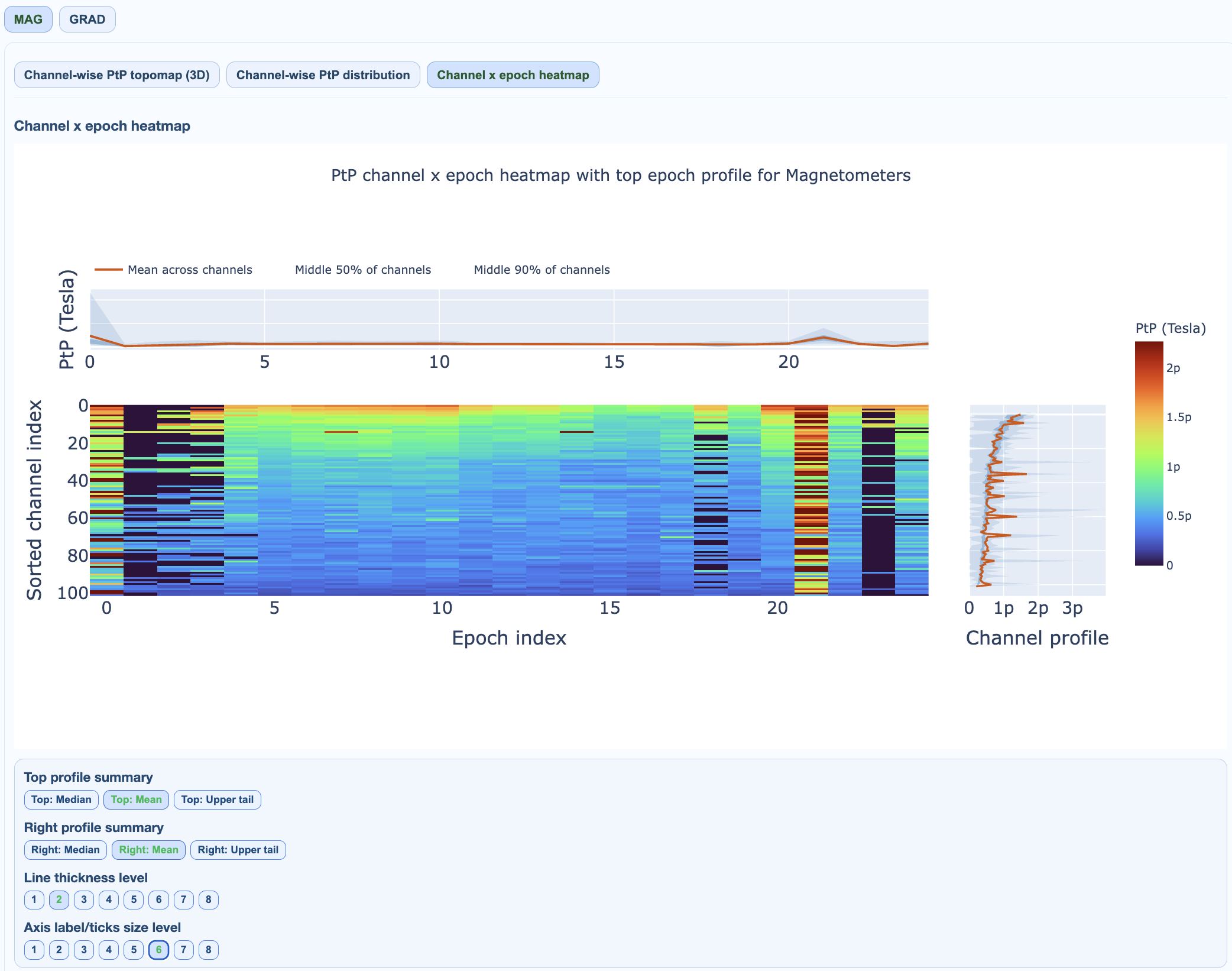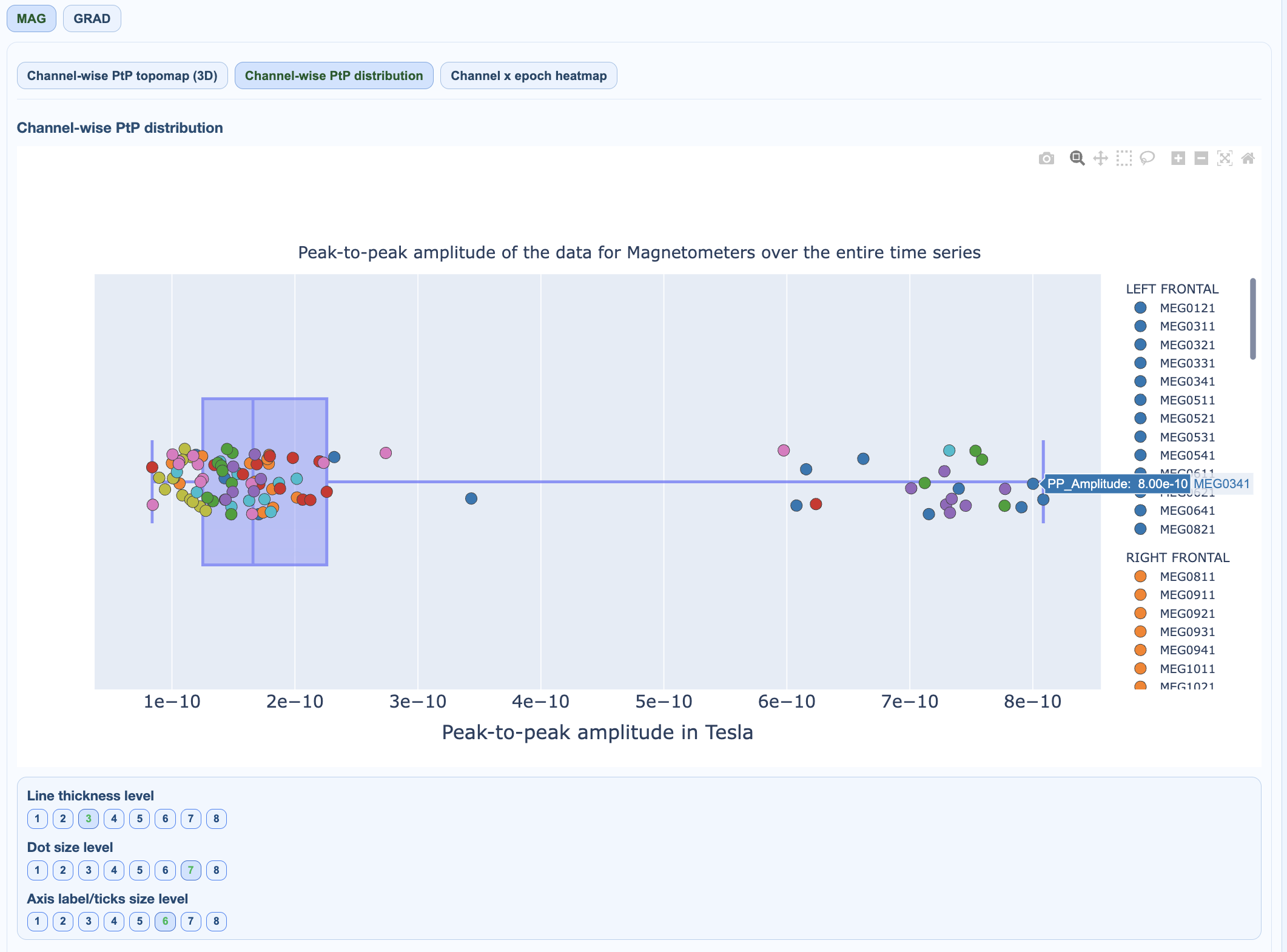 The same visualization patterns apply to both MAG and GRAD channel types. PtP (auto) uses MNE’s built-in detection algorithm, while PtP (manual) uses MEGqc’s custom thresholding approach.