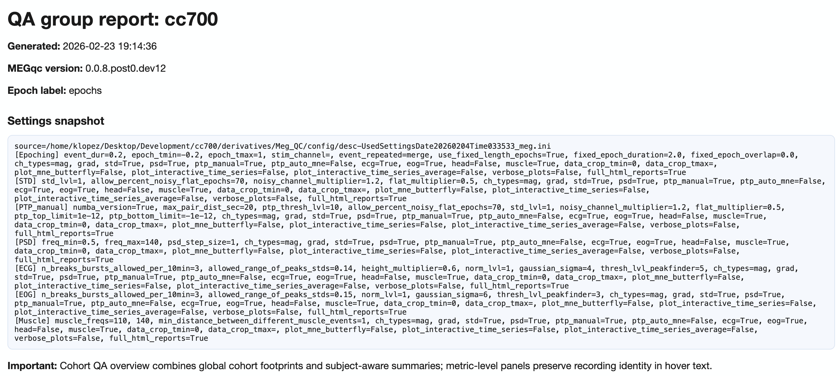 The header of the report shows you a snapshot of the settings used for your QA group report. This is useful for documentation and reproducibility purposes, as you can always check which parameters were used to generate the report. Then, you can choose to show or hide the grids for all visualizations as well as the channel types.