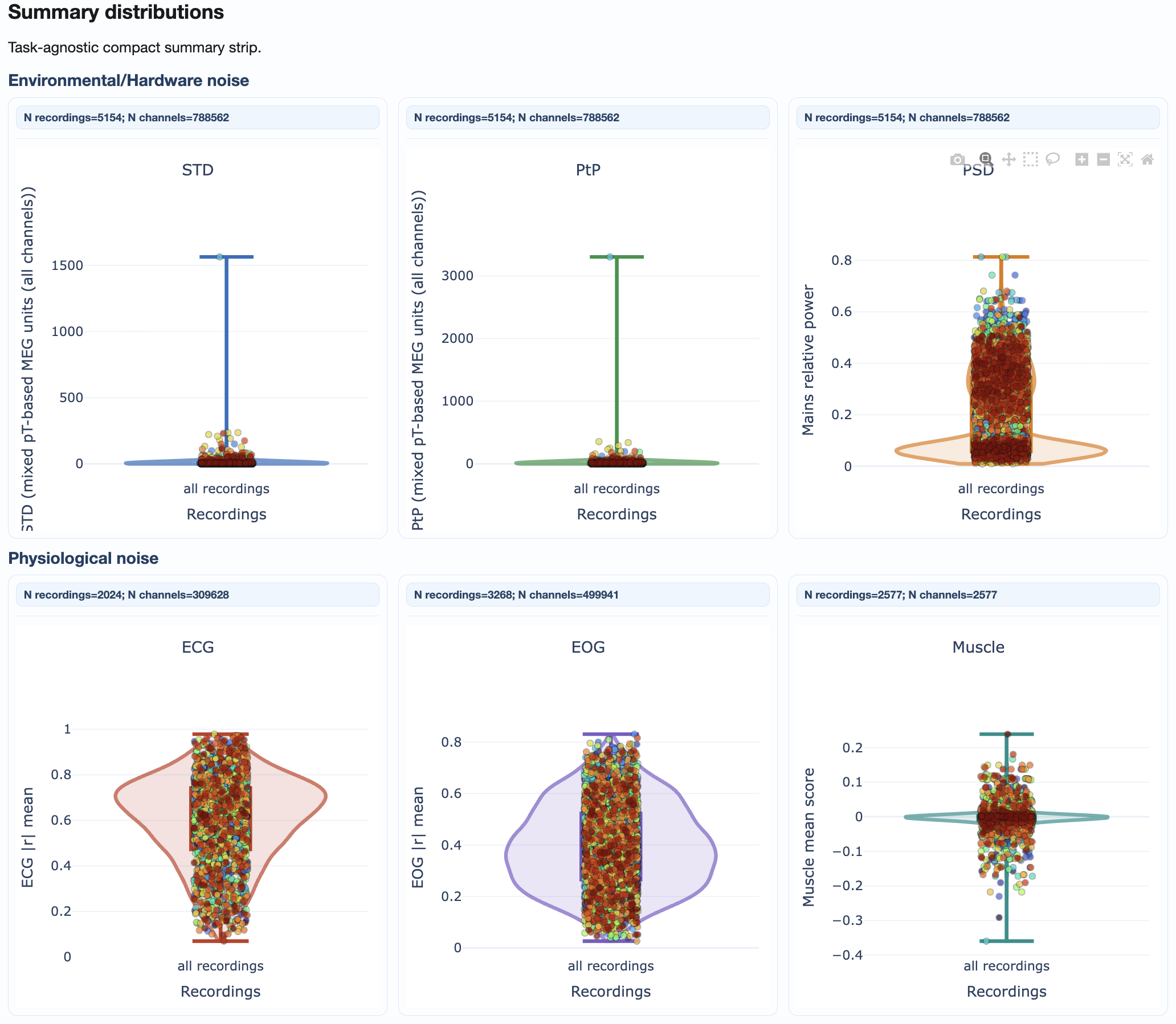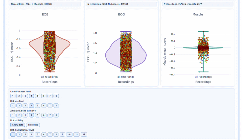 As with many other figures, you can hover over individual points to see the subject/recording ID and exact metric value. You can also modify many visibility aspects such as the thickness of the violin and boxplot lines, the size of the individual points, the axis label and ticks fontsize and the displacement of the individual points to avoid overlap with the background elements.