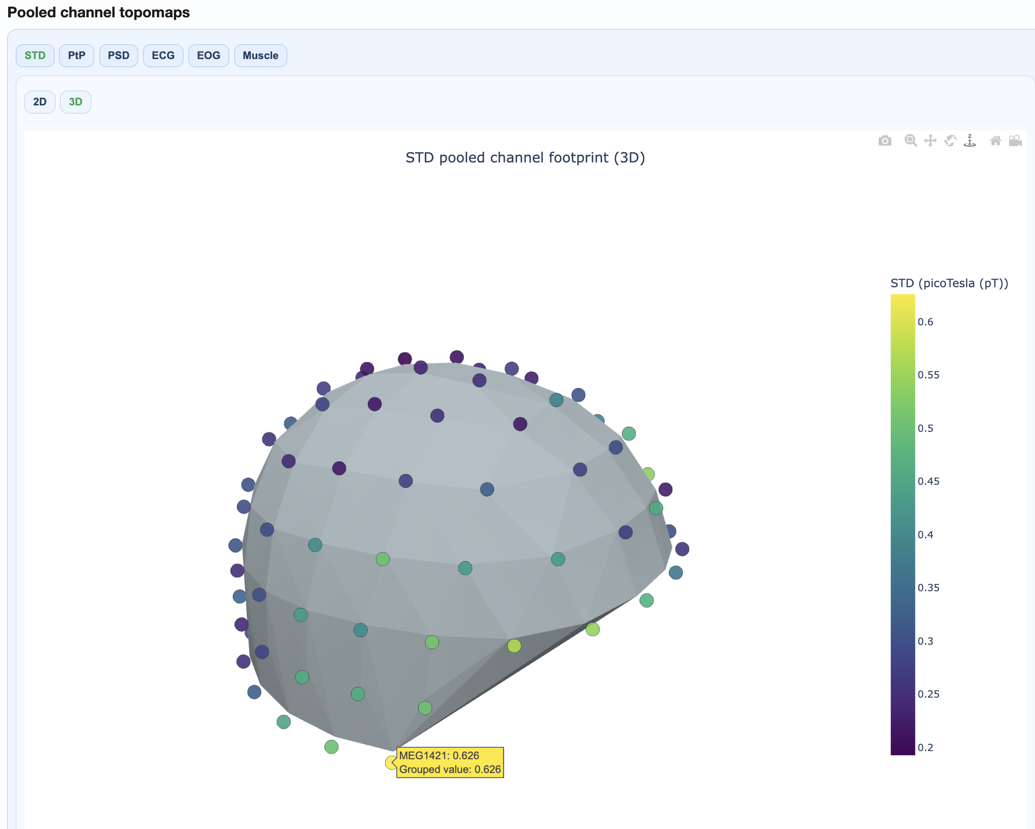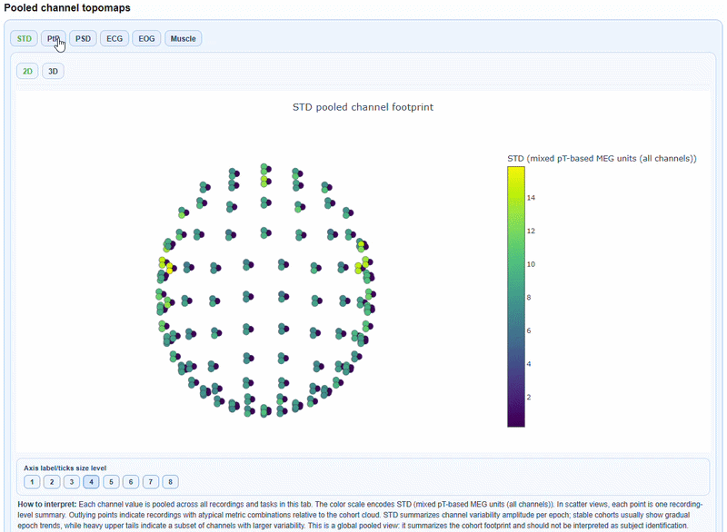 You can see a 2D topomap or a 3D topomap of each metric averaged across all recordings and channels. This gives a quick overview of where quality issues tend to concentrate across the cohort. The 3D topomap also has a Cap on mode to add a solid cap for improved visualization.