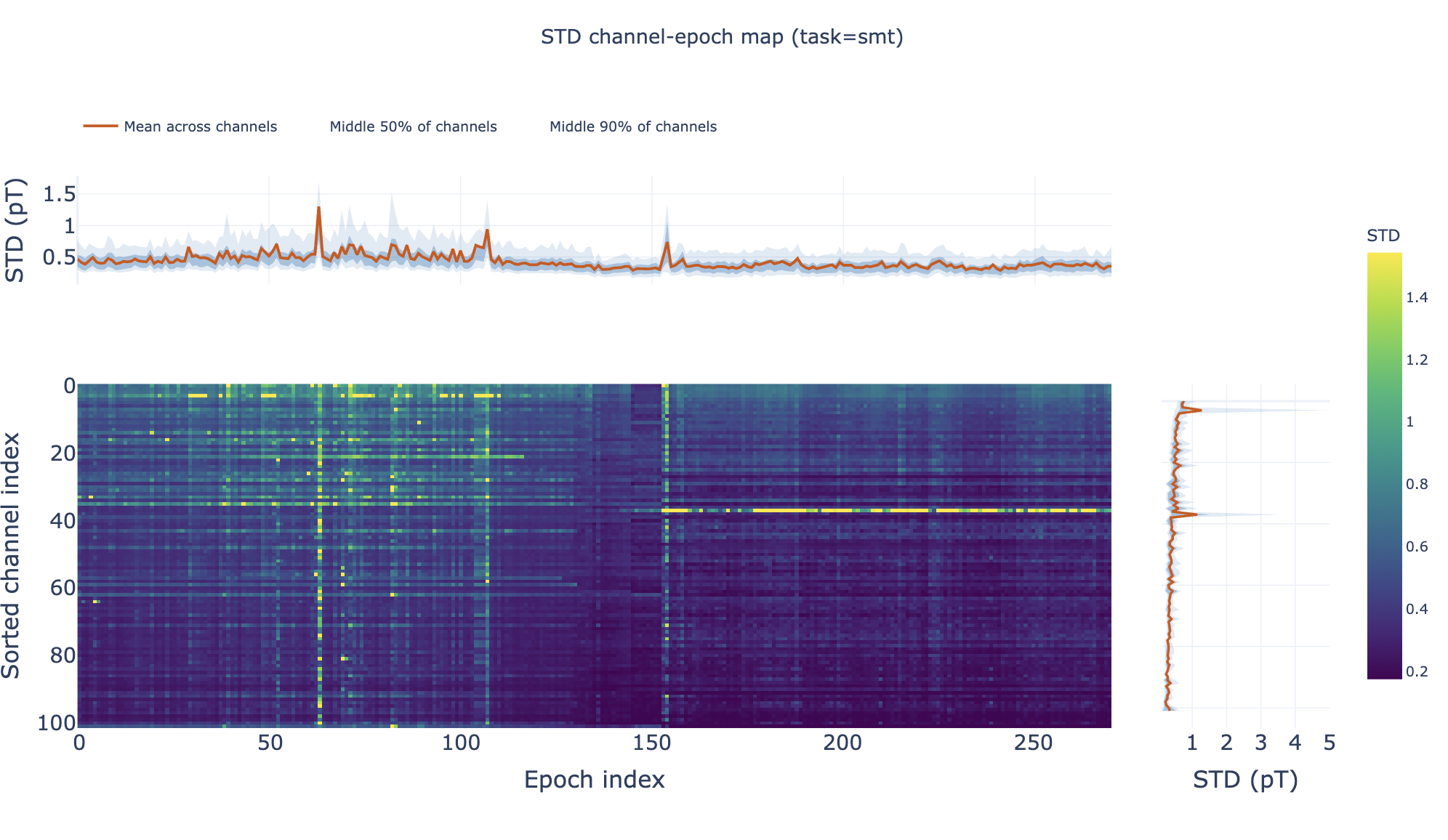 Shows epoch-wise STD values (y-axis) for 12 subject across all channels in every epoch (x-axis). The dark central line represents the median STD across channels, while the shaded envelopes show the interquartile range (IQR) and 5-95% percentiles. If you hover over the plot, you can see the exact STD values for each epoch.