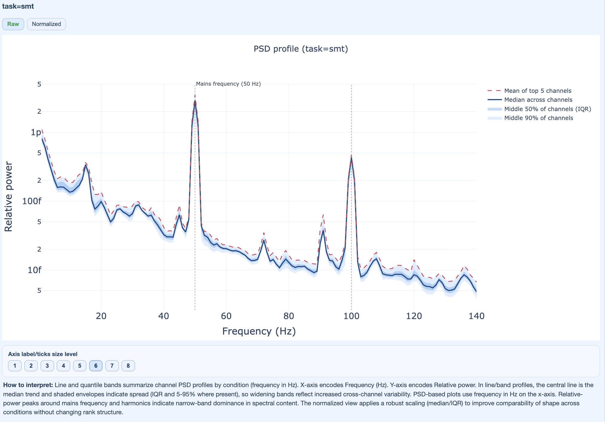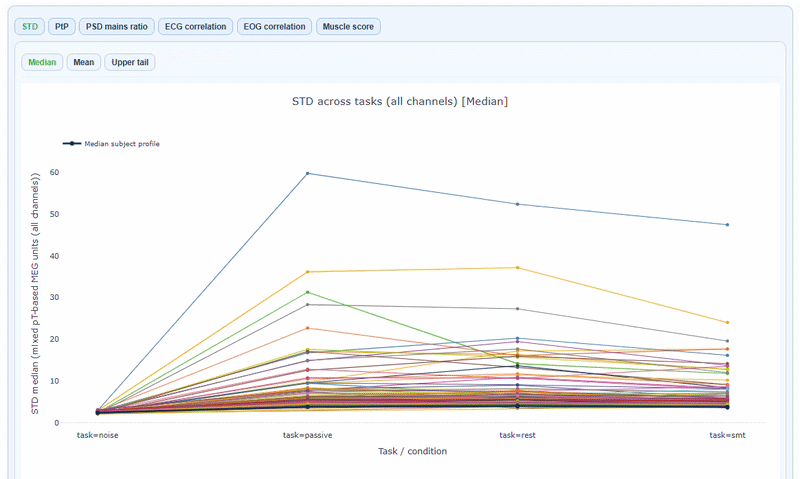 The x-axis shows the different tasks/conditions, while the y-axis shows the metric value (e.g., STD, PtP, etc.). Each line represents one subject, allowing you to see how their quality metrics change across tasks. You can hover over each line to see the subject ID and exact metric values for each task. The black line of every plot shows the cohort median profile across subjects. In every metric subtab you can choose to show the Median, the Mean or the Upper Tail (95th percentile) of the metric distribution across channels tasks. Every figure has a “How to interpret” section that explains how to read the plots and what patterns to look for.
