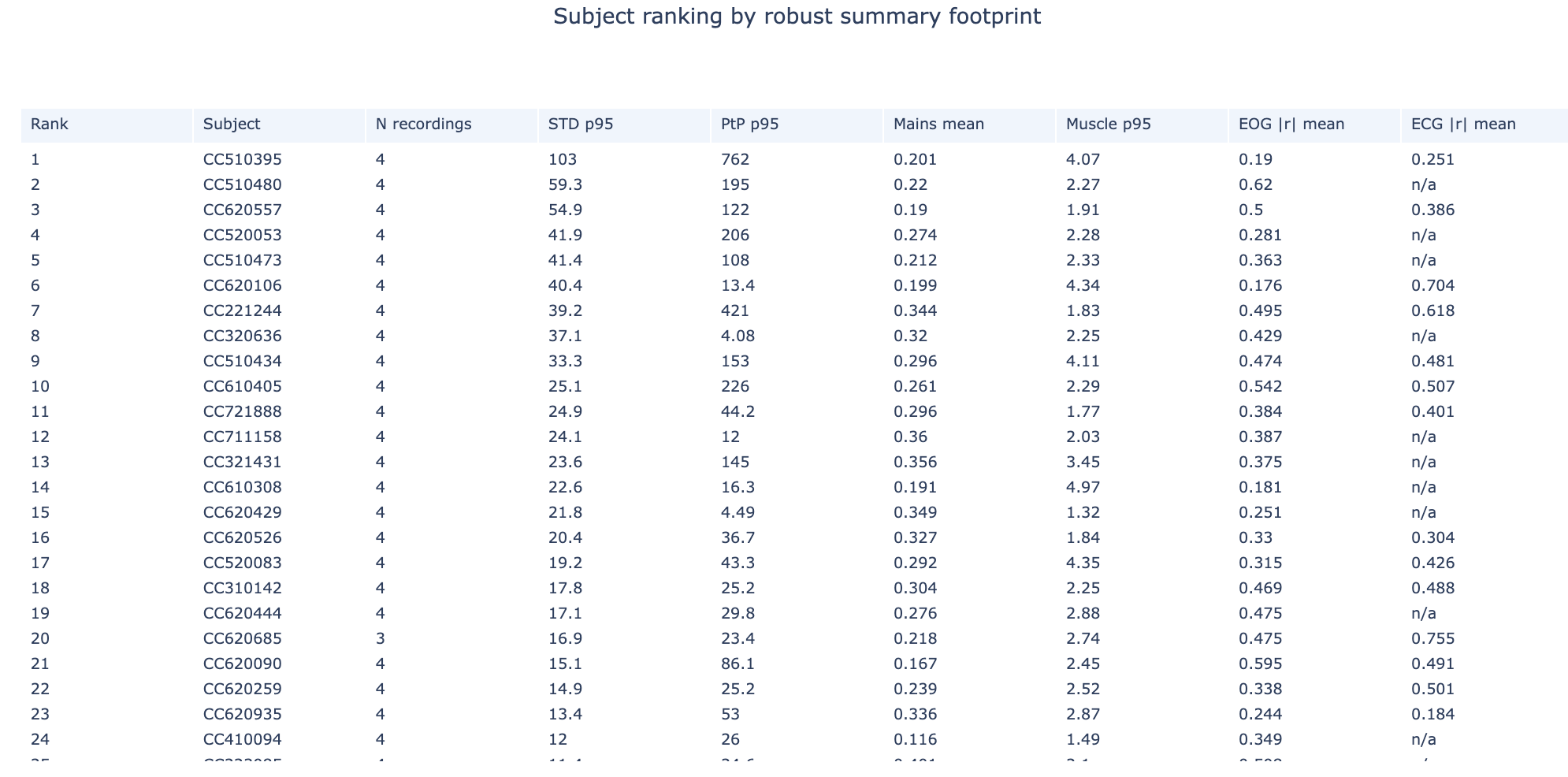 Shows aggregated metrics per subject, pooling all their recordings. It identifies which subjects are generally problematic across all their data, regardless of how many recordings they have.