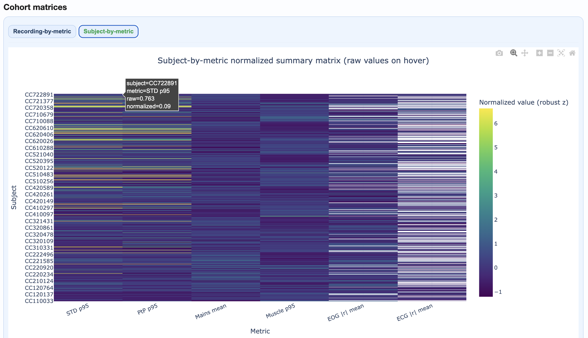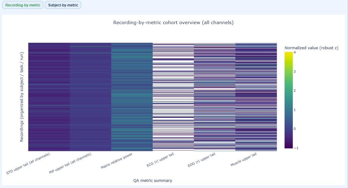 Two complementary heatmaps help you understand quality patterns at different levels of detail. As in other figures, you can hover over individual cells to see the subject/recording ID and exact metric value. You can also modify many visibility aspects such as the axis label and ticks fontsize.