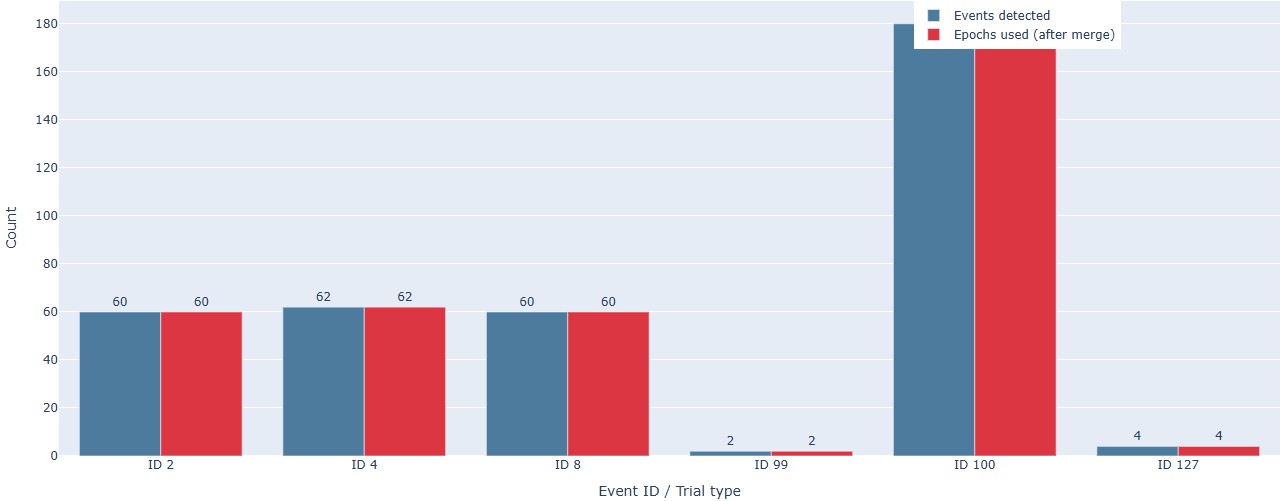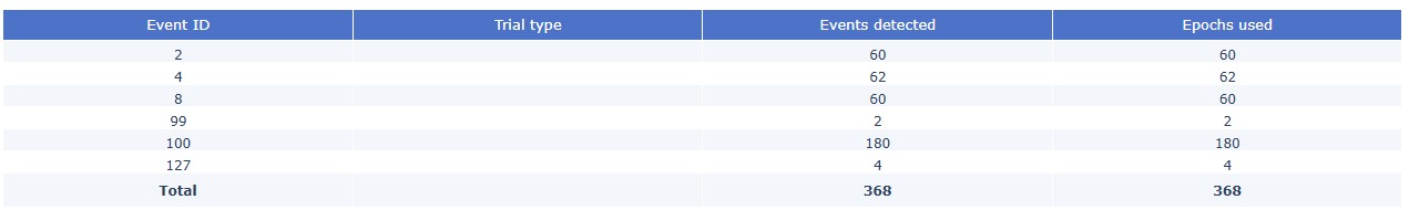 _events.tsvfiles, which are obtained from the onset within the task. They are usually more accurate and complete than the events obtained from the stim channel, which are based on hardware triggers. This table shows how many of the events detected were used for the epochs calculation.