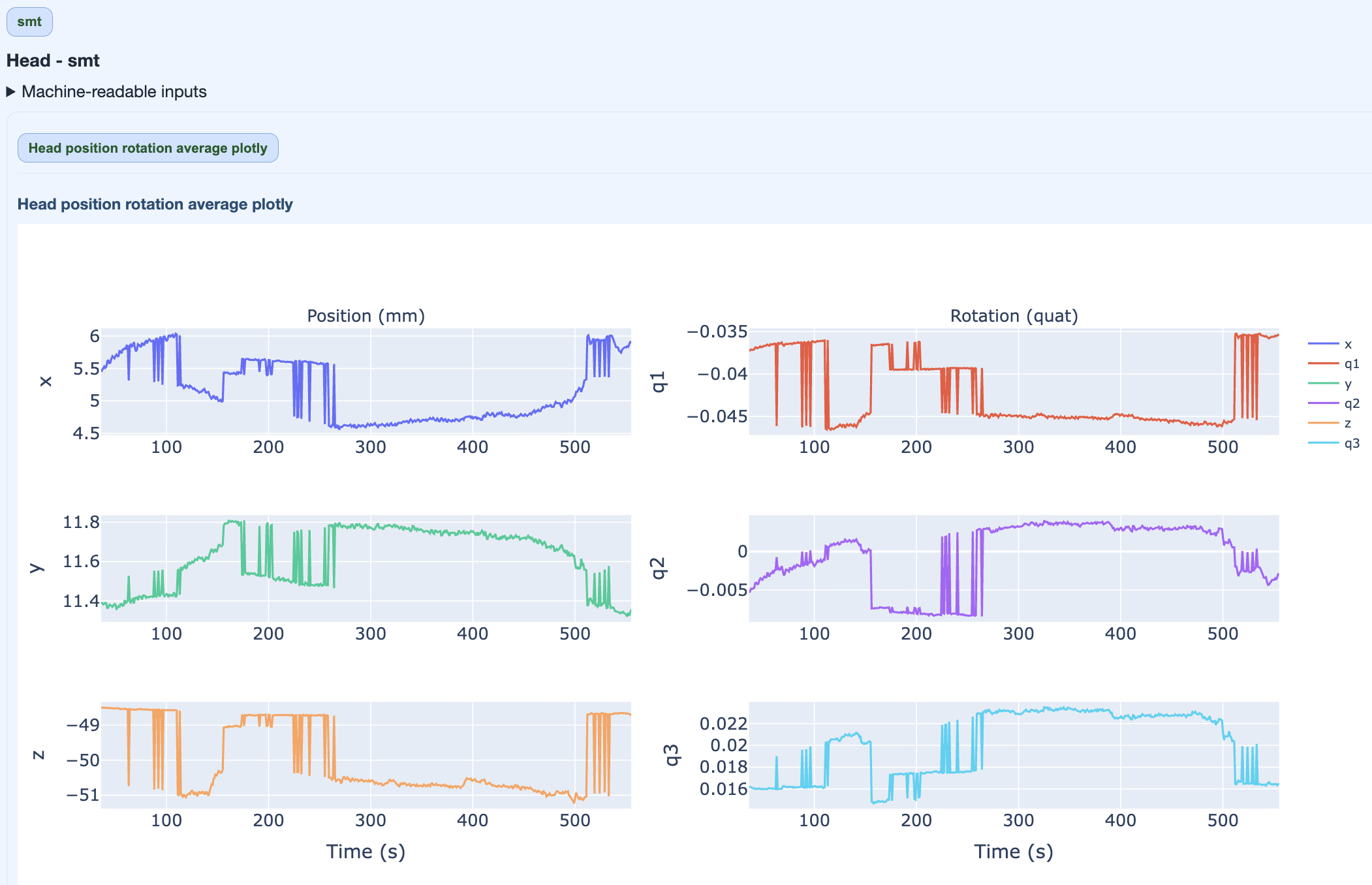This figure quantifies overall movement magnitude across the recording in every direction (x, q1, y, q2, z, q3). It helps you identify segments with exessive movement. High movement can degrade data quality and may require exclusion or correction.