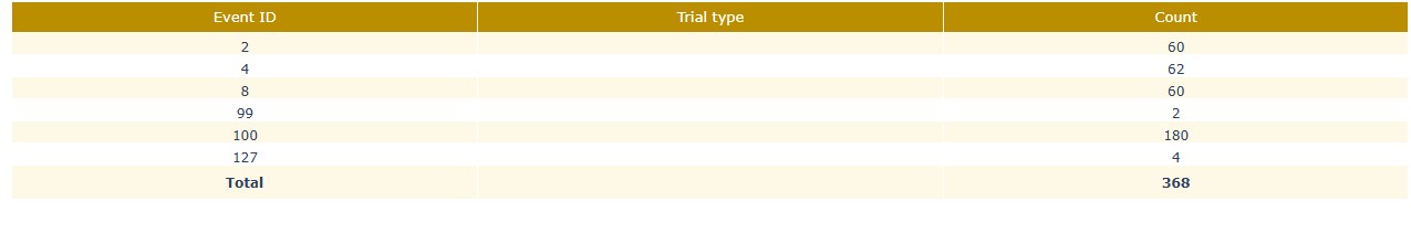 Stimulus BIDS events summary: The events summary table shows the count of each event ID and trial type (if available) for each run/task. This can help you to check whether the expected number of events are present and whether the trial types are correctly annotated.