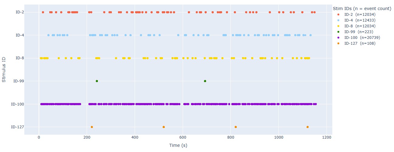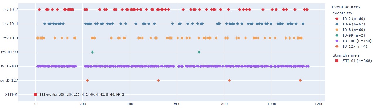 Stimulus: It shows the timeline of events within the stimulus channel, with different colors representing different trigger IDs. This can help you to compare with the BIDS events timeline and check for consistency. It can also reveal any irregularities in the stimulus channel, such as missing triggers, unexpected trigger timings, or clustering of triggers. There is a subtab per stimulus channel, in case there are more than one.