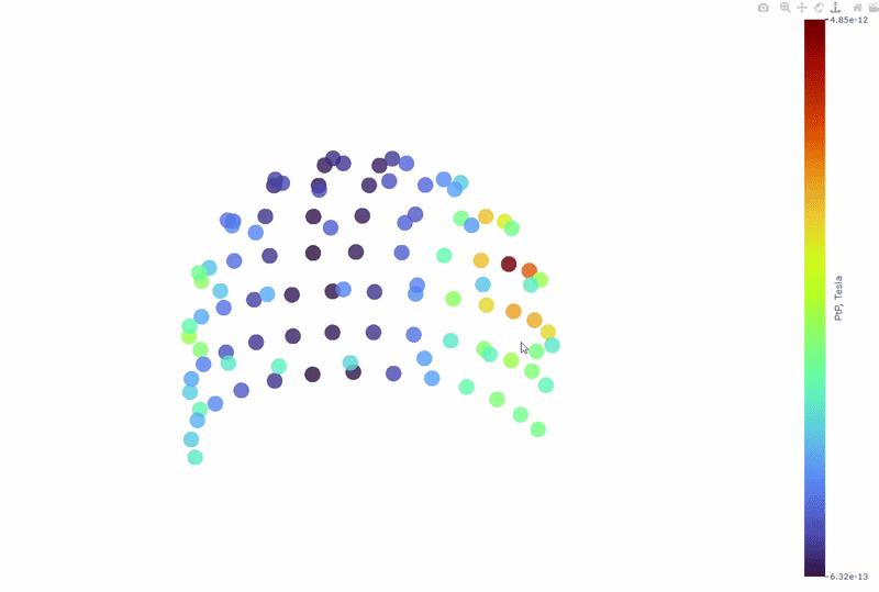 Each dot represents a sensor, and its color indicates the PtP value, the colorbar shows the range of PtP values in Tesla. This allows you to identify sensors with high excursion amplitudes, which may indicate transient artifacts or outlier events.