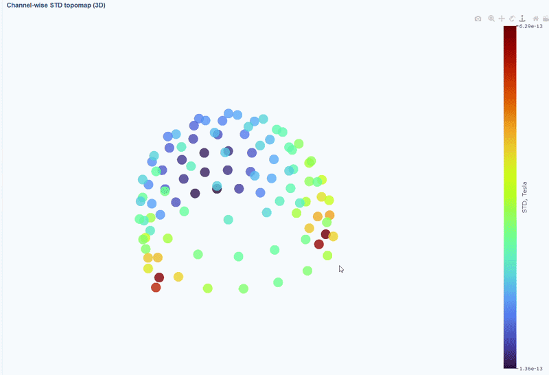 This plot shows the spatial distribution of channel variability across the head. Sensors are color-coded by their STD values (with a colorbar indicating the range). This allows you to quickly identify hot areas of sensor burden or isolated islands. You can interact with the 3D scene as in the Overview tab: You can rotate the head to see sensors from different angles, by clicking and dragging the mouse. You can also zoom in and out using the scroll wheel. Names and STD values appear on hover.