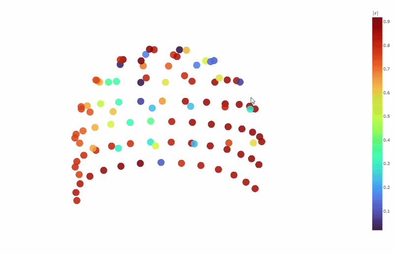 Channel-wise EOG topomap (3D): This plot shows the spatial distribution of EOG artifacts across the head. Sensors are color-coded by their average EOG artifact amplitude. This allows you to quickly identify hot areas of ocular contamination. As in other topomaps, you can use the