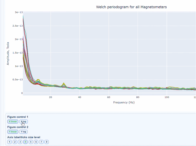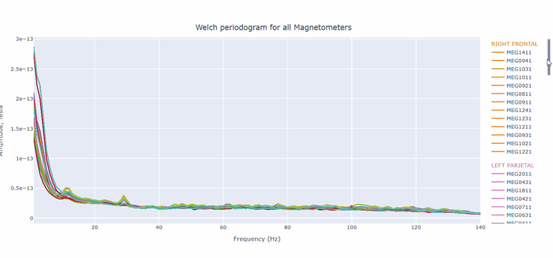 On hover you can see the channel name and the PSD value at that frequency (e.g., MEG0211: 1.2e-13 at 50Hz). This allows you to identify channels with high power in specific frequency bands.
