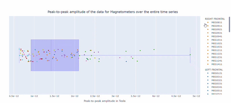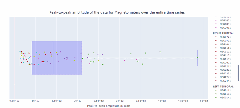 The boxplot shows the distribution of PtP values across channels. Each dot represents a channel, and its color indicates the lobe group. The x-axis shows the range of PtP values in Tesla, with extreme right-values indicating channels with high excursion amplitudes. The position on the Y-axis does not hold information. On hover, you can see the channel name and PtP value (e.g., MEG0211: 4.37e-13).