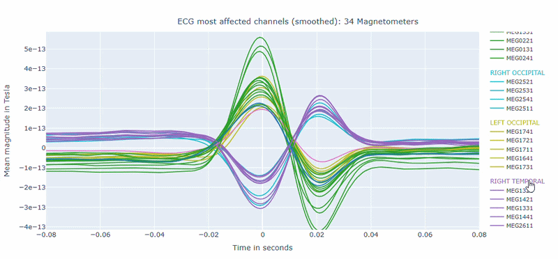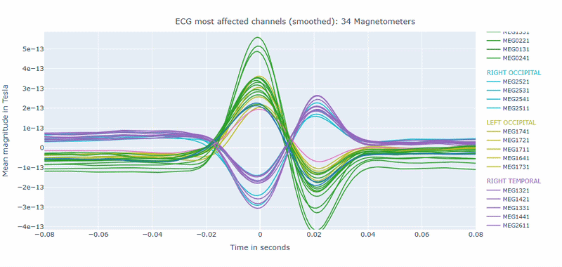 Correlation-magnitude channels: There are three plots showing the correlation between the ECG signal and the MEG channels, sorted by magnitude (highest, middle and lowest). This can help you to identify which channels are most affected by cardiac artifacts.