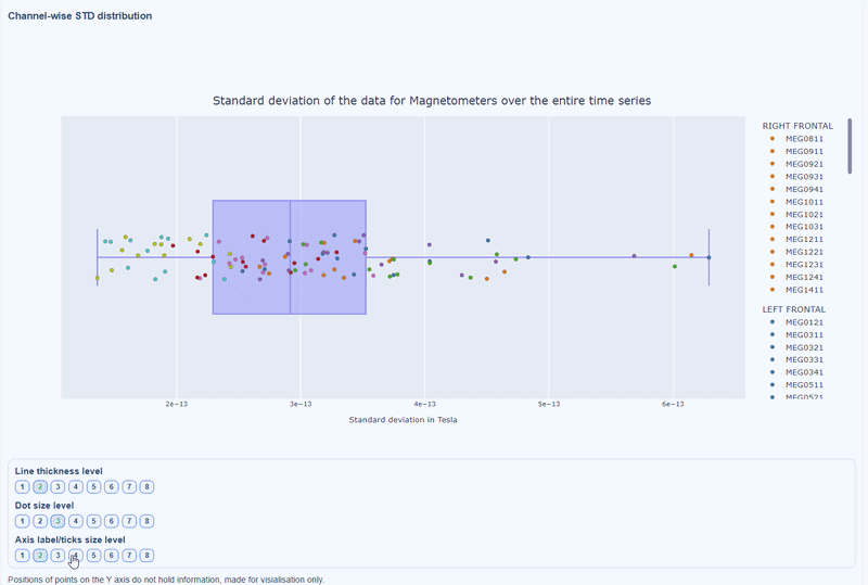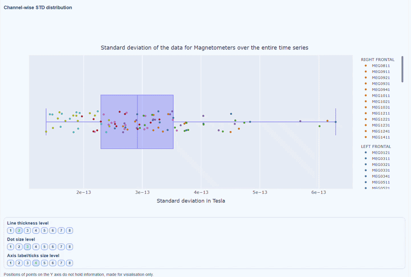 Every dot represents one channel, you can see the name and STD value on hover (e.g., MEG0211: 4.37e-13). The x-axis shows you the range of STD values in Tesla, extreme left-values (close to zero) indicate flat channels, while extreme right-values indicate highly variable channels. The position on the Y-axis do not hold information. The channels dot are color-coded by lobe group.