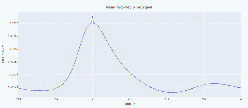 It contain a general visualization of the EOG signal itself (blue) and the detected peaks (red dots). You can also see the average recorded blink signal.