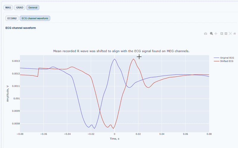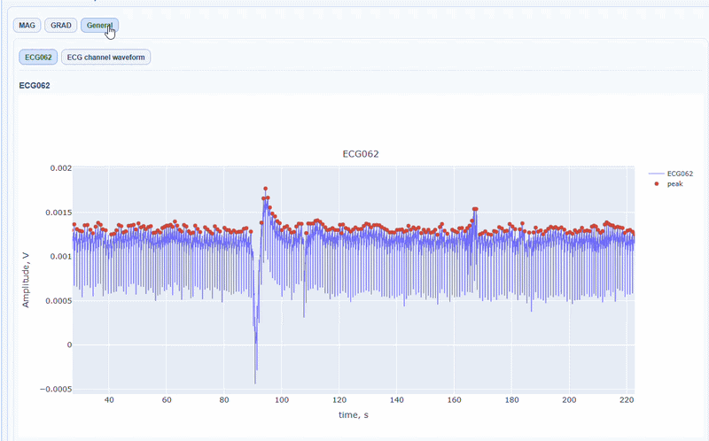 Apart from the MAG and GRAD sub-tabs, there is a General sub-tab that contains visualizations of the ECG signal itself, which can be useful to check the quality of the ECG signal and the accuracy of the peak detection.