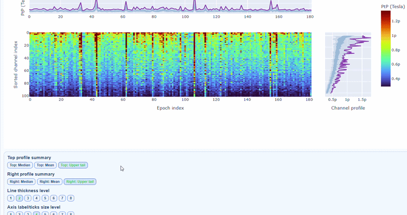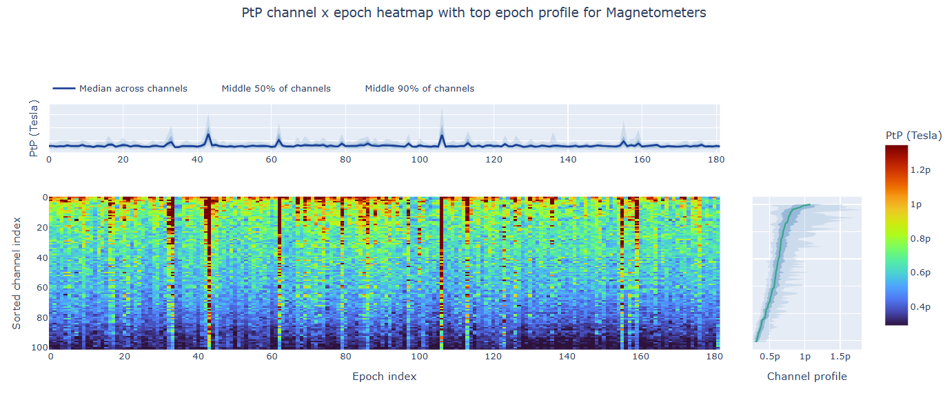 The top profile shows the average PtP across channels for each epoch, which can reveal epochs with overall high excursion amplitudes. The right profile shows the average PtP across epochs for each channel, which can highlight channels with consistently high excursion amplitudes. You can choose (with the menu below) to plot the median, the mean or the upper tail (75th percentile), to better capture different types of epoch-level or channel-level burden.