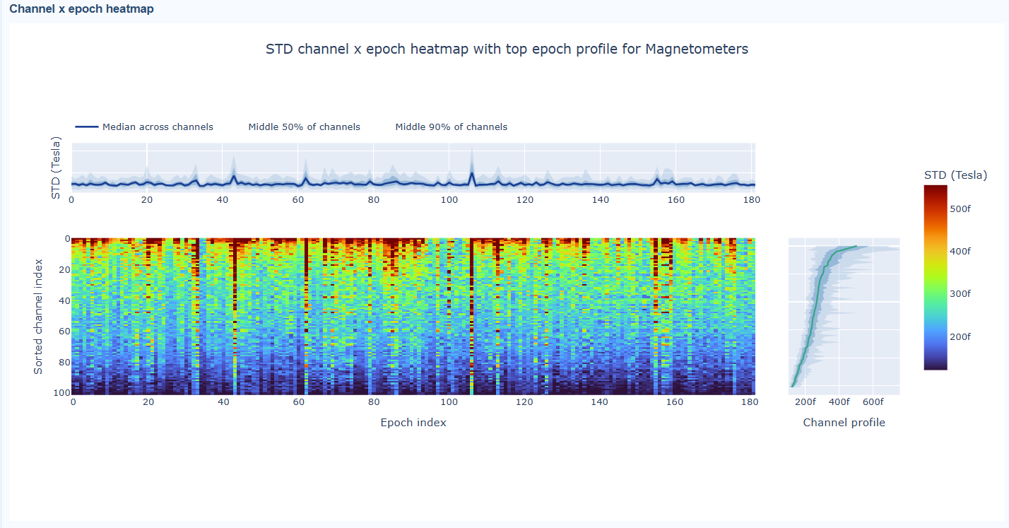 The color of each cell indicates the STD value for that channel in that epoch, with a colorbar showing the range. This allows you to identify temporal patterns of variability, such as transient bursts (vertical bands) or persistent channel issues (horizontal bands).