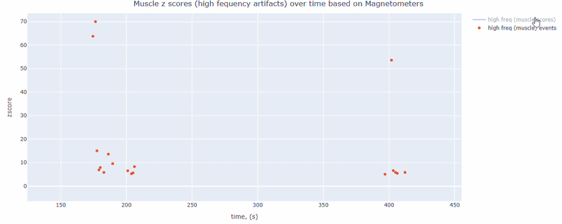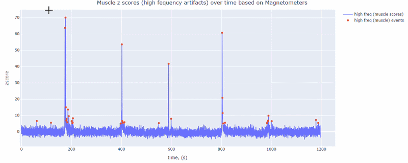 This metric shows high frequency artifacts in range between 110-140 Hz. High power in this frequency band compared to the rest of the signal is strongly correlated with muscles artifacts, as suggested by MNE. However, high frequency oscillations may also occur in this range for reasons other than muscle activity (for example, in an empty room recording).